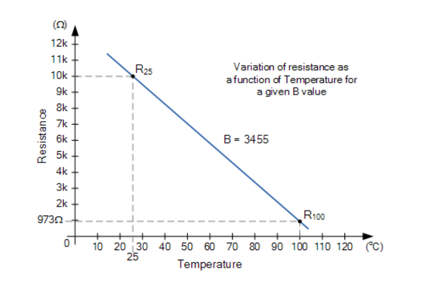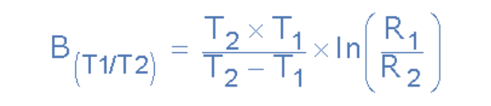 因此,B 值将定义热敏电阻在第一个温度或基点(通常为 25°C,称为 T1)的电阻值,以及热敏电阻在第二个温度点(例如 100°C,称为 T2)的电阻值。