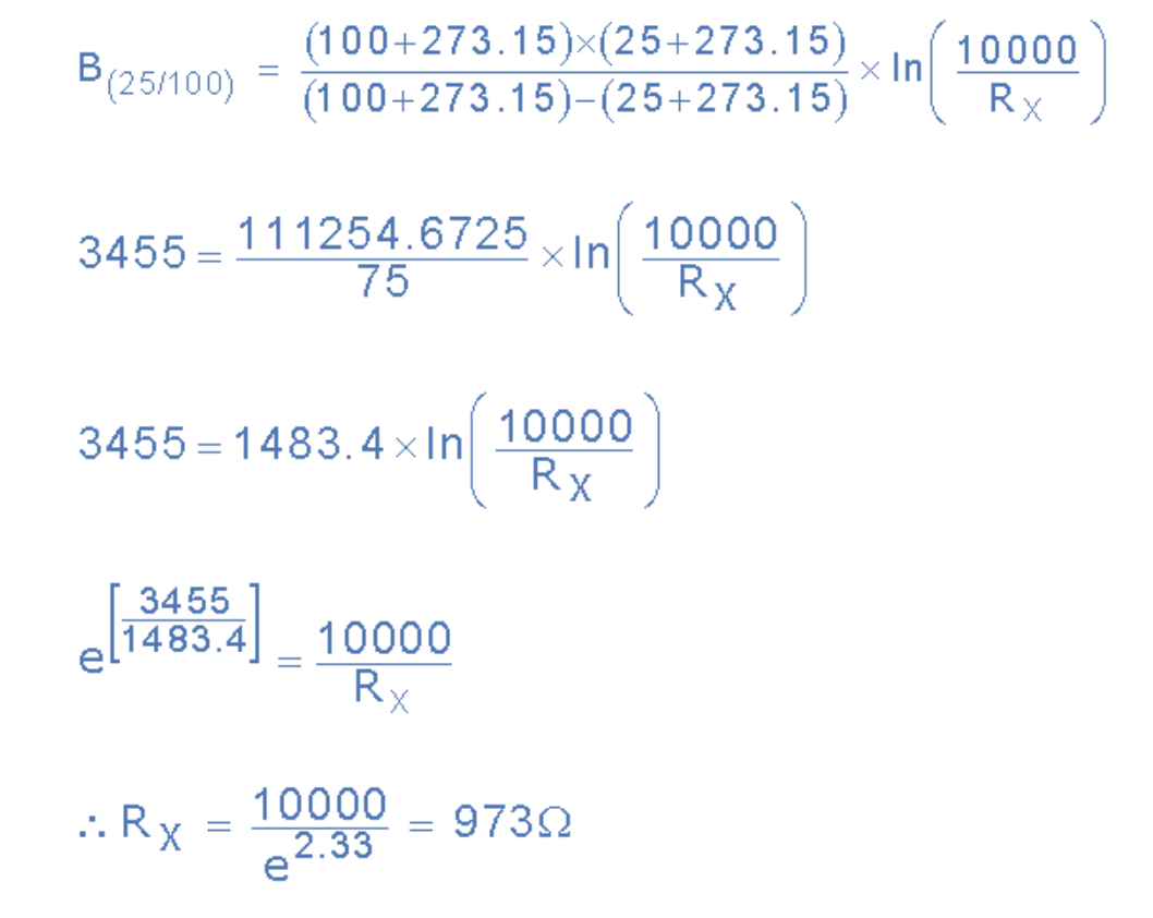 给定数据:B = 3455,R1 = 10kΩ(25°C)。为了将温度从摄氏度(°C)转换为开尔文(K),添加数学常数 273.15。