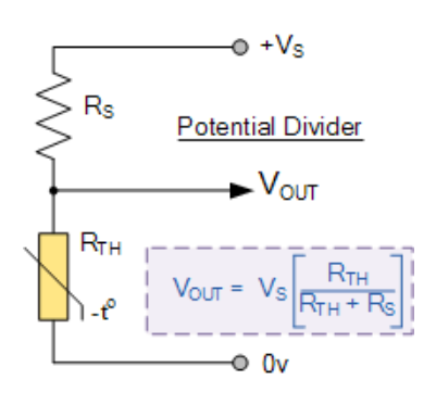 最简单的实现方法是使用热敏电阻作为分压电路的一部分,如图所示。恒定电源电压施加在电阻和热敏电阻串联电路上,输出电压从热敏电阻两端测量。