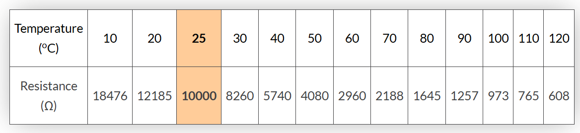 例如,如果我们使用 10kΩ 热敏电阻和 10kΩ 的串联电阻,则在 25°C 的基极温度下,输出电压将为电源电压的一半,因为 10Ω/(10Ω+10Ω) = 0.5。