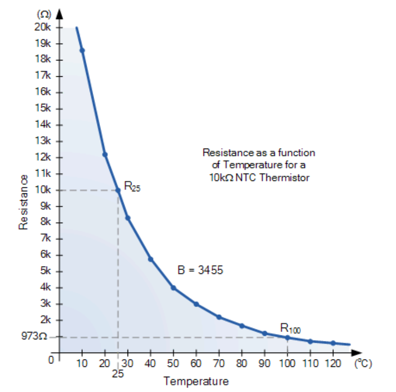 我们之前说过,热敏电阻是一种电阻高度依赖于温度的电子元件,因此如果我们通过热敏电阻发送恒定电流,然后测量其两端的电压降,我们就可以确定其在特定温度下的电阻。