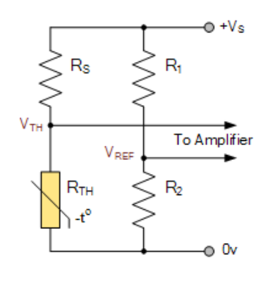 如果我们交换串联电阻 RS 和热敏电阻RTH 的位置,则输出电压将朝相反方向变化,即热敏电阻越热,输出电压越高。