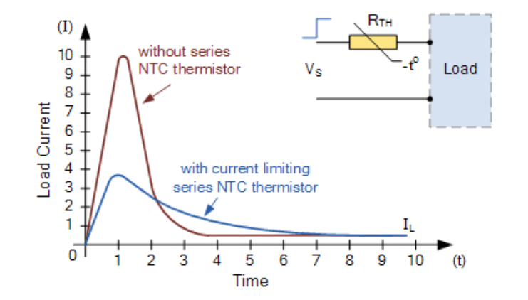 我们还看到,除了用于测量外部温度外,热敏电阻还可以用于控制电流,这是由于流经它的电流引起的 I²R 热效应。通过将 NTC 热敏电阻与负载串联连接,可以有效地限制任何高浪涌电流。